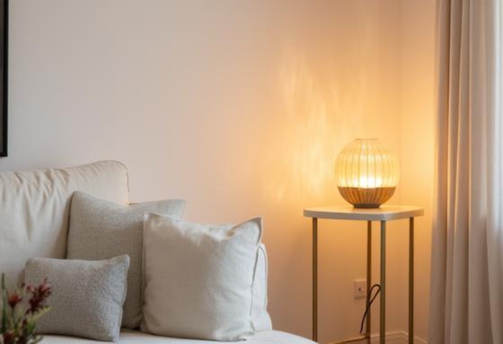 Think “layers.” A calm home rarely relies on one bright ceiling light. Soft lighting signals safety and rest.